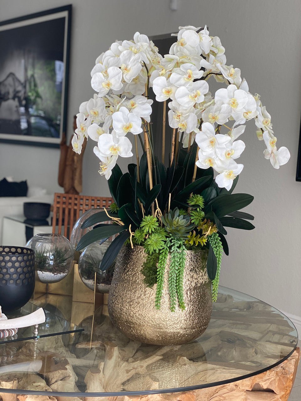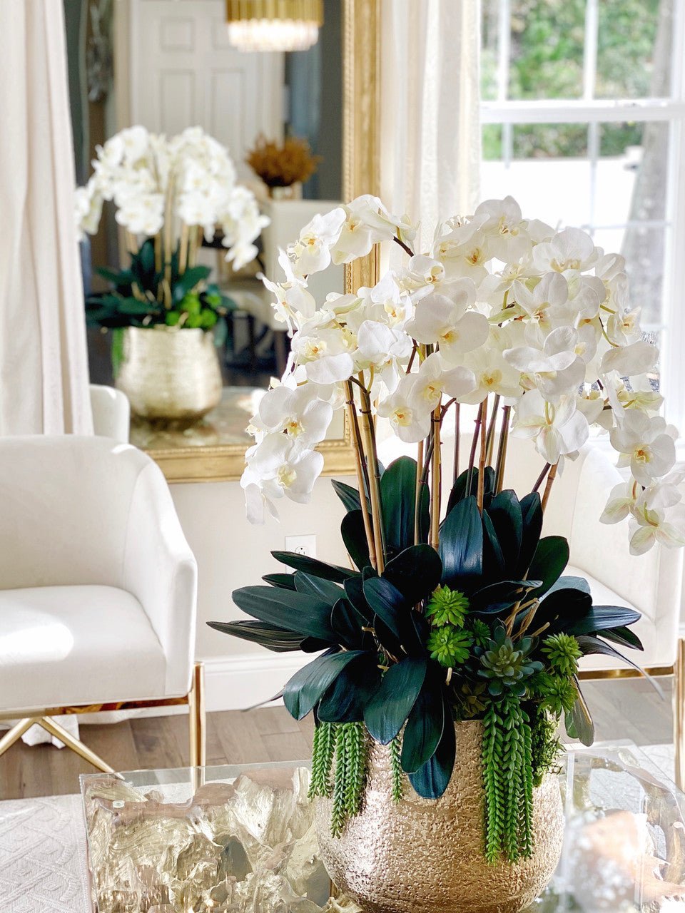 Often called the moth orchid. the Phalaenopsisis a favorite among our designers for its dense leaves. elegantly arching sprays. and lovely white blooms. Our remarkably lifelike arrangement is staked into a moss-covered Delany textured gold pot.Exceptional craftsmanship is presented at spectacular scale in this gorgeous white Phalaenopsis arrangement. showcased the Delany Pot which is cast from aluminum. then polished and electro-plated for a textured gold finish and simple silhouette. It’s designed for drama and destined to get attention: Display it on your dining room tabletop. or let this Phalaenopsis orchid make a great first impression in the foyer.